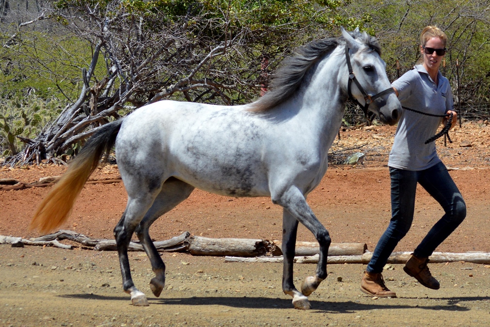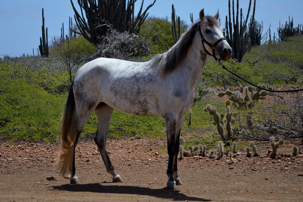At Rancho Washikemba horse ranch Bonaire we have a very cute grey Paso Fino mare, who was born with us already almost 5 years ago! we still think she’s a baby, but hey, almost 5 years old already! She is not broke to ride yet, we prefer a horse to be fully grown before we start to ride. She is already taller then her mom Marybell, she only has to grow some wider still!