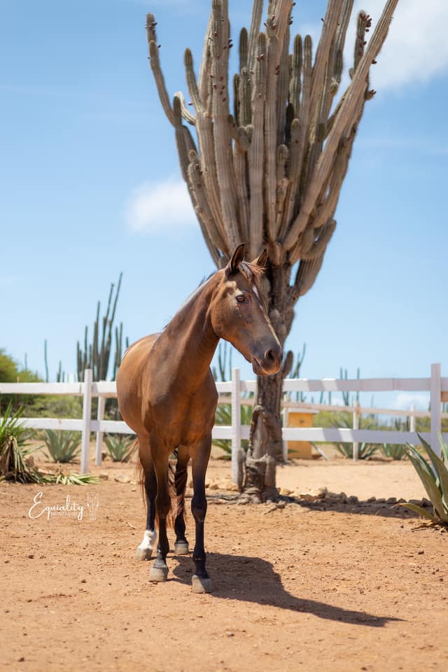 She was born and raised on Bonaire. She’s is quite insecure, but usually hides that by acting mean. Once you gain her trust, she is very soft and sweet. Because of that, she only joins the trail rides ridden by Irene and she’s also doing really well with some of our experienced riders in the riding lessons.